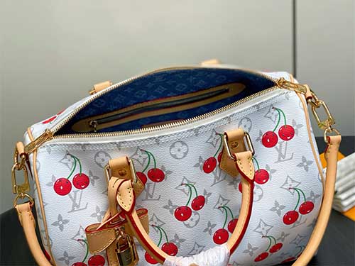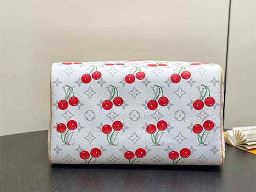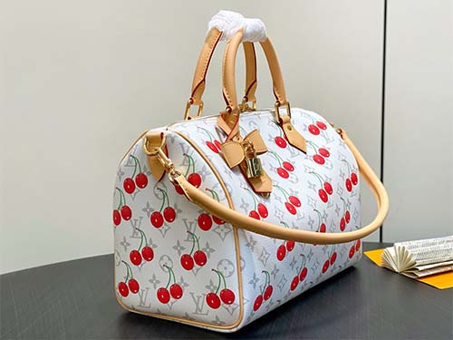 The Speedy Soft 30 bag from the Louis Vuitton x Takashi Murakami re-edition collection blends classic Monogram canvas with playful cherry motifs inspired by Murakami’s Superflat art philosophy. Designed with long Toron handles for shoulder carry, polished hardware and a signature padlock, it delivers a modern expression of travel elegance and contemporary fashion spirit.