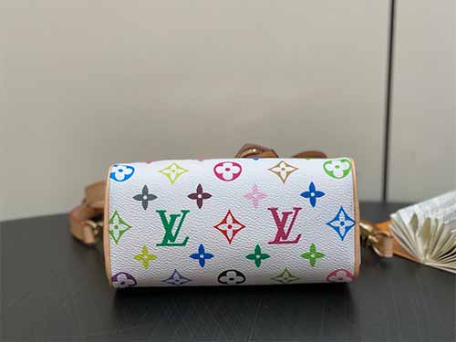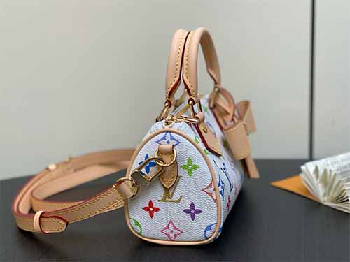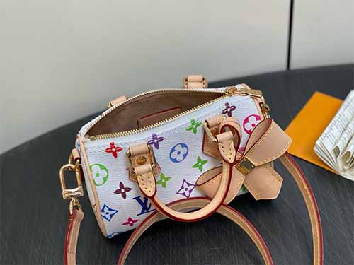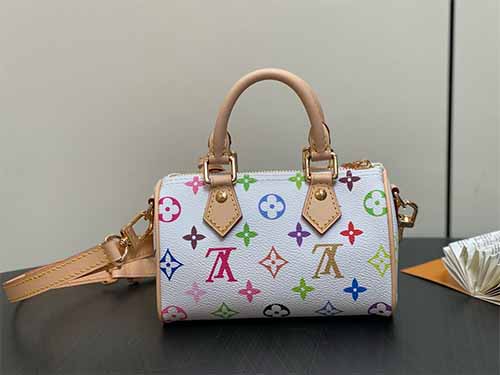 The Nano Speedy from the Louis Vuitton x Takashi Murakami collaboration revives the iconic Speedy silhouette in a playful miniature format. Crafted from signature Monogram canvas with refined cowhide leather trim, this design showcases Murakami’s legendary Multicolor Monogram, expressed through 33 vivid hues. Released in both White Multicolor and Black Multicolor editions, the Nano Speedy has become a global phenomenon,