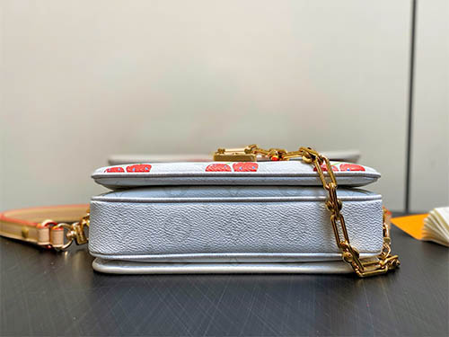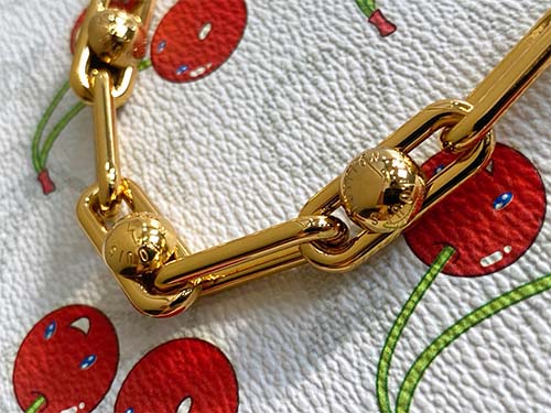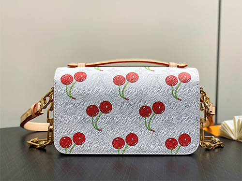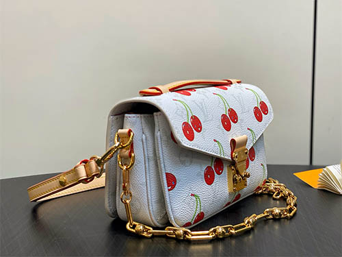 The Pochette Métis East West HL bag from the Louis Vuitton x Takashi Murakami collection reimagines a house icon with playful artistry. Crafted in Monogram coated canvas with soft seasonal tones, the sweet cherry motif adds a vibrant signature. Finished with a glossy S-lock closure and refined chain strap, this compact silhouette offers elegant versatility for everyday city wear.
