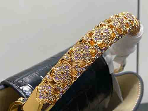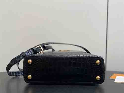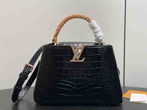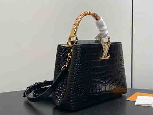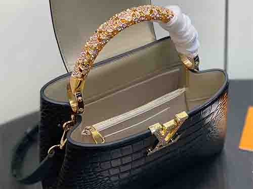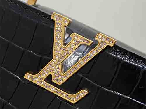 From the prestigious Exceptionals Collection, this Capucines BB handbag redefines refined luxury through exceptional detailing and craftsmanship. Crafted from premium Taurillon leather with an elegant crocodile-embossed finish, the structured silhouette is elevated by crystal-set LV initials that radiate jewel-like brilliance. The striking floral-shaped handle, inspired by the iconic Flower Crown necklace, adds a couture touch. Designed for versatility, the flap may be worn inside or outside,