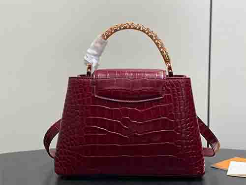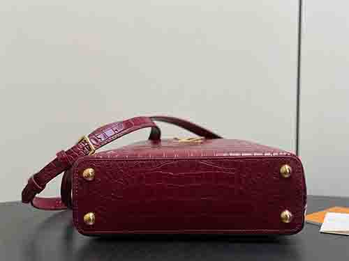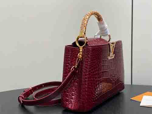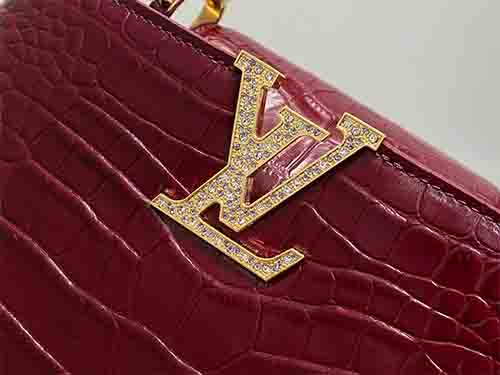 From the prestigious Exceptionals line, this Capucines BB handbag elevates the Maison’s iconic silhouette with refined craftsmanship and jewel-like detailing. Crafted from luxurious Taurillon leather with a crocodile-embossed finish, the design is enhanced by rhinestone-set LV initials and a radiant floral handle inspired by the Flower Crown necklace. The structured body balances elegance and strength, while the versatile flap may be worn inside or outside. Multiple carrying options make it suit