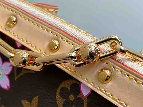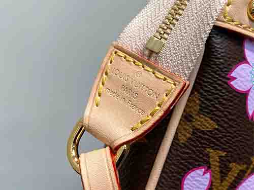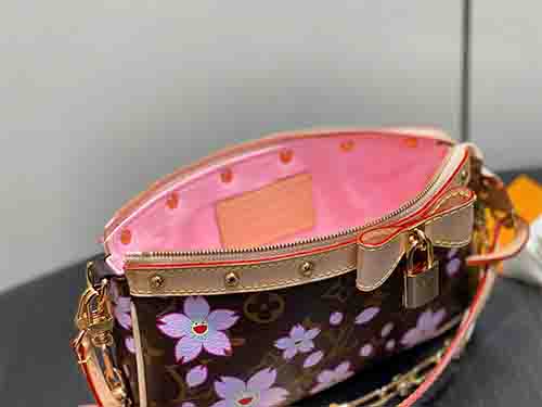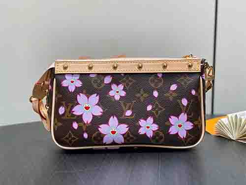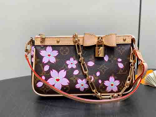 The M13666 Pochette Accessoires reinterprets the iconic Monogram canvas through the playful Cherry Blossom motif inspired by Takashi Murakami. Part of a revival collaboration series, this compact shoulder bag blends artistic expression with classic craftsmanship. A leather bow and LV-engraved padlock accent highlight the upper edge, while stud detailing and a removable chain strap add a bold, modern touch. Compact yet statement-making, it is designed to transition effortlessly from day styling