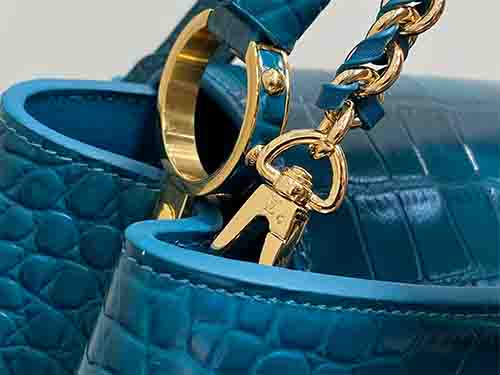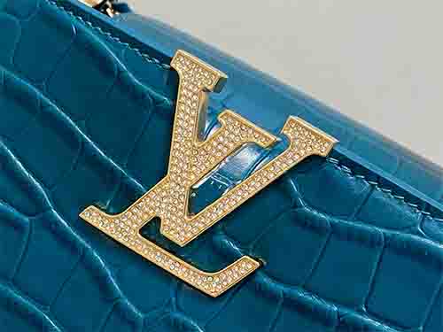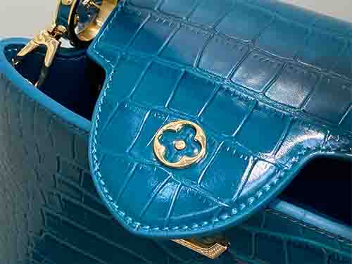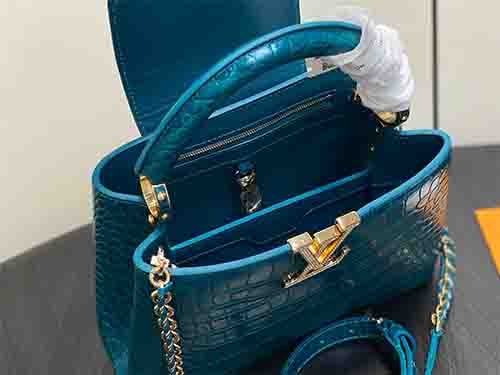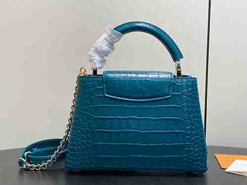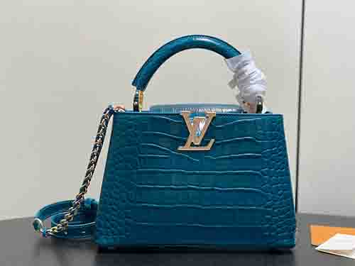 The Capucines BB from the Exceptionals Collection showcases refined craftsmanship in teal croc-embossed Taurillon leather. This collectible edition elevates the iconic silhouette with sculpted structure, leather-wrapped LV initials, and luminous hardware. Designed for versatility, it transitions effortlessly between top-handle, shoulder, and crossbody wear. The adjustable flap can be styled inside or outside, revealing a well-organized interior suited for modern essentials.