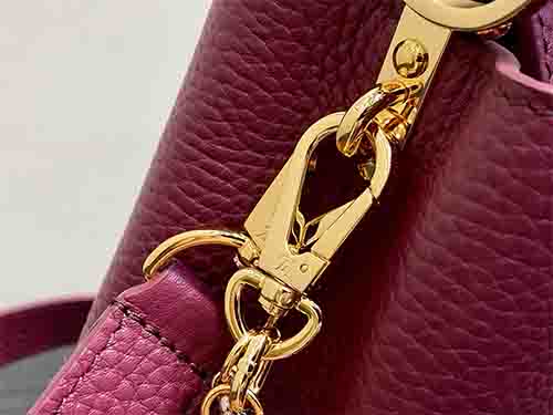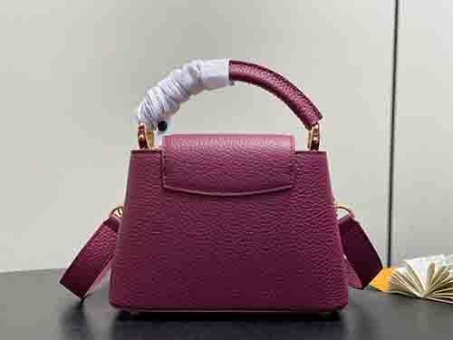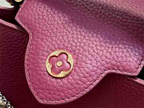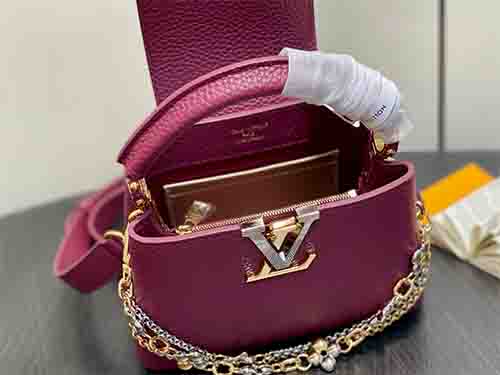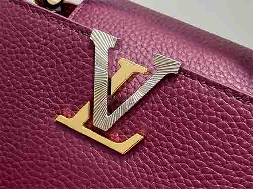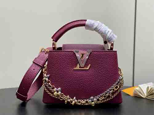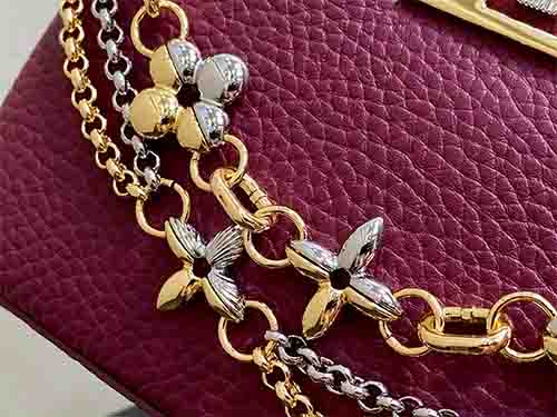 The Capucines Mini in burgundy embodies modern elegance with a jewelry-inspired infinity chain detail. Crafted from luxurious Taurillon leather, this refined silhouette is enhanced by LV initials finished with a radiant Sunburst effect and double-plated hardware. Designed to transition effortlessly from day to evening, it balances structure and sophistication. The removable strap allows crossbody or shoulder wear, while the top handle offers a polished handheld option.