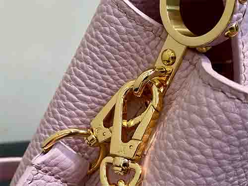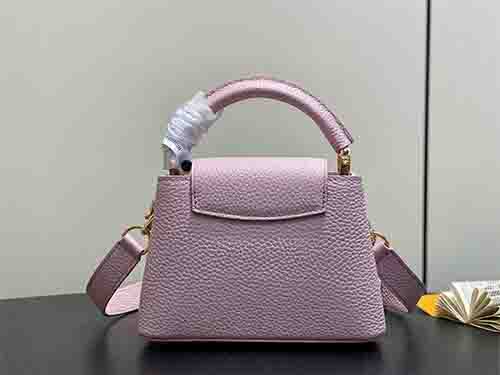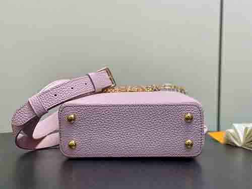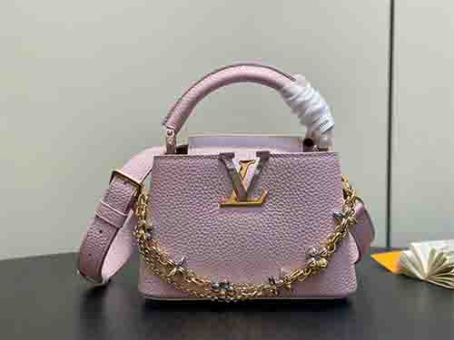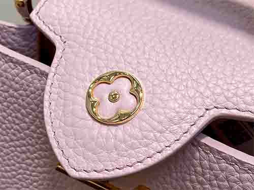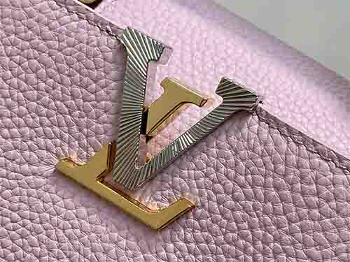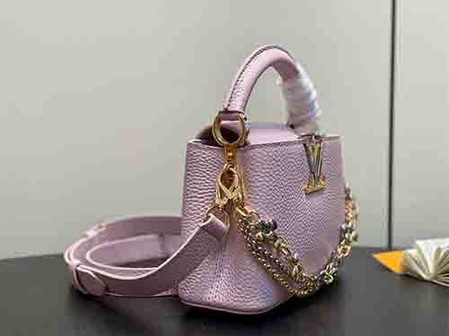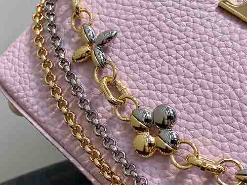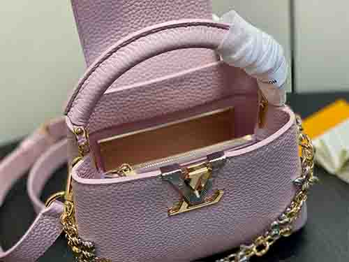 The Capucines Mini in soft pink expresses refined femininity with a modern jewelry-inspired infinity chain. Crafted from premium Taurillon grained leather, this structured silhouette is enhanced by LV initials finished with a radiant Sunburst effect and double-plated hardware. Designed to transition effortlessly from day to evening, it delivers timeless sophistication with contemporary edge. Wear it crossbody or on the shoulder using the removable strap, or carry it elegantly by the top handle.