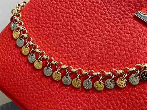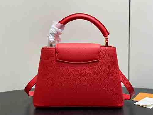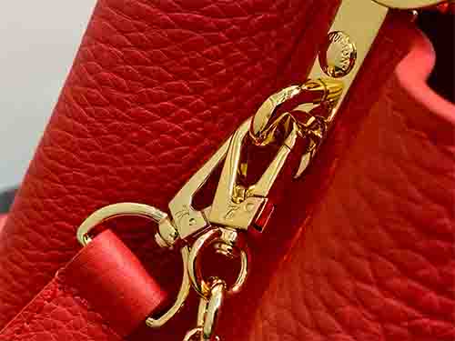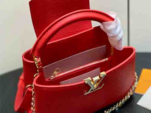 The LV Confetti collection presents the upgraded Capucines BB in striking red Taurillon leather. Enhanced with a refined decorative chain and the iconic LV emblem, this seasonal edition reflects exceptional craftsmanship and modern elegance. Its well-balanced size accommodates daily essentials such as a smartphone, compact wallet, and keys, making it an ideal choice for polished city commuting and elevated everyday styling.