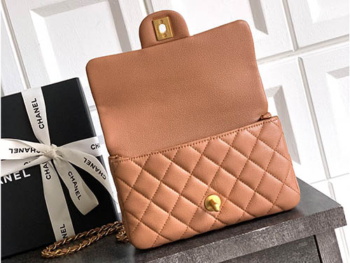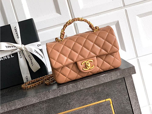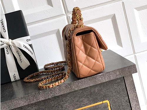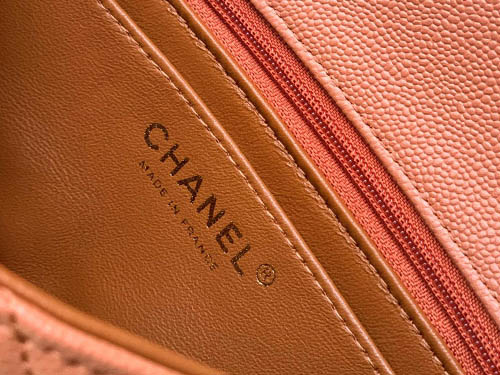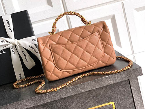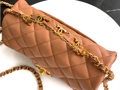 La bolsa Chanel CF Handle de la colección Chanel 25B en color caramel brown presenta una elegante reinterpretación del icónico diseño flap de Chanel. Fabricada en cuero caviar texturizado.