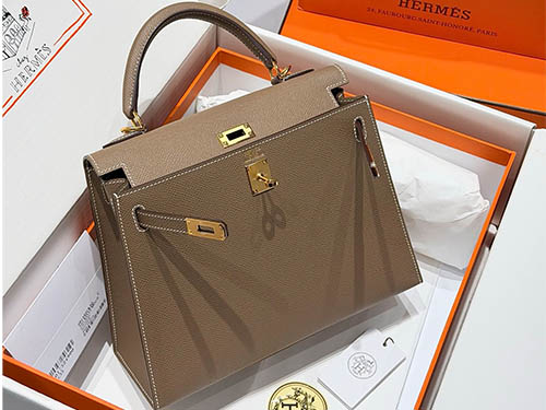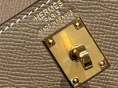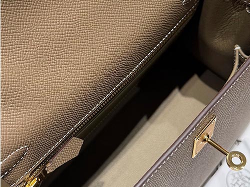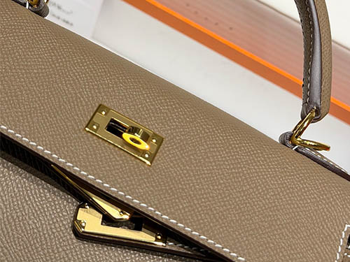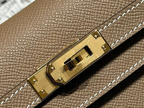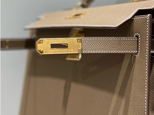 No couro Epsom, a cor apresenta maior definição e estrutura, reforçando a silhueta da bolsa Kelly. Seu peso visual médio garante presença sem excessos, ideal para uso diário e exposição premium no varejo.